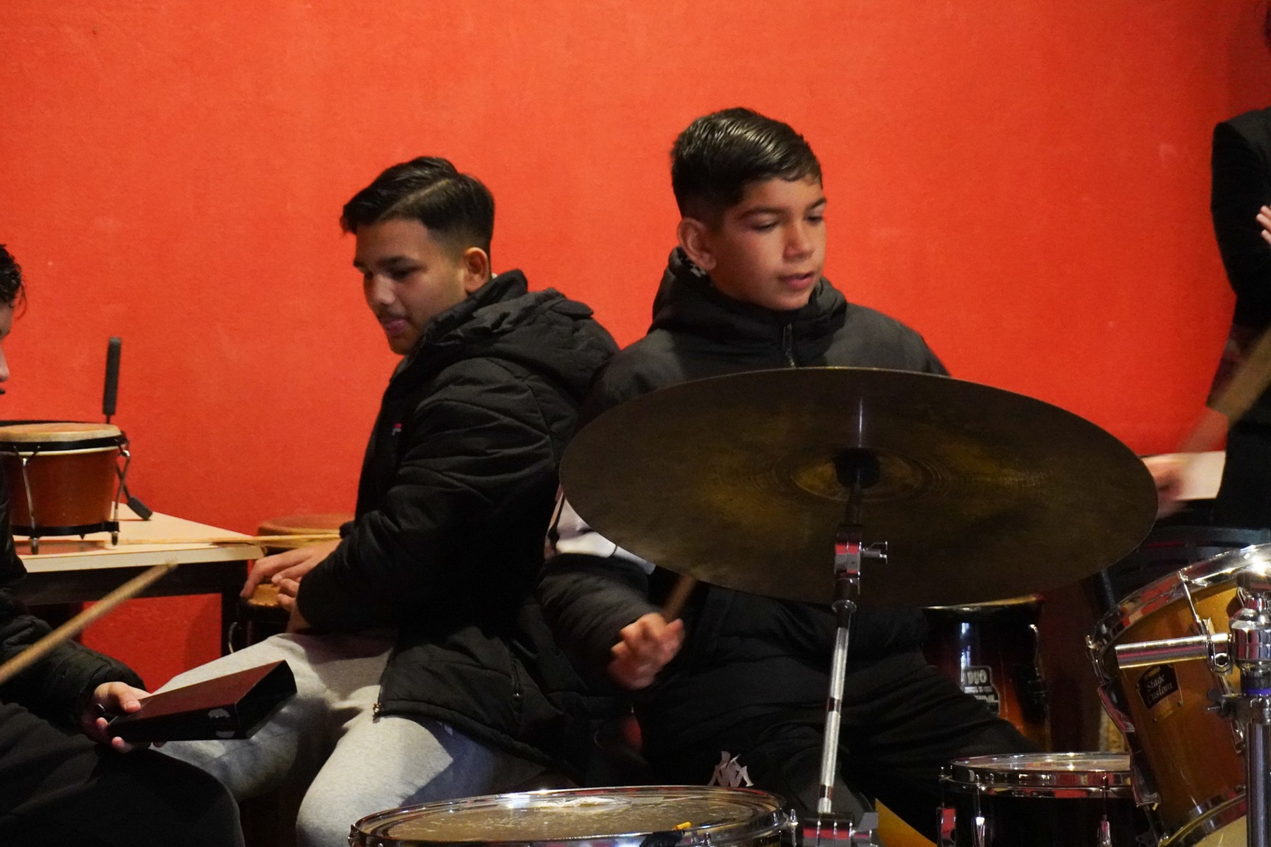 Pendant ce temps, les collégiens, venus en demi-groupe pour profiter pleinement du studio enregistrement, attendent Tino. Pour combler les quelques minutes de libre, ils sont allés voir les instruments dans le studio 5 et ont pu montrer leurs talents de pianistes ainsi que de batteur…