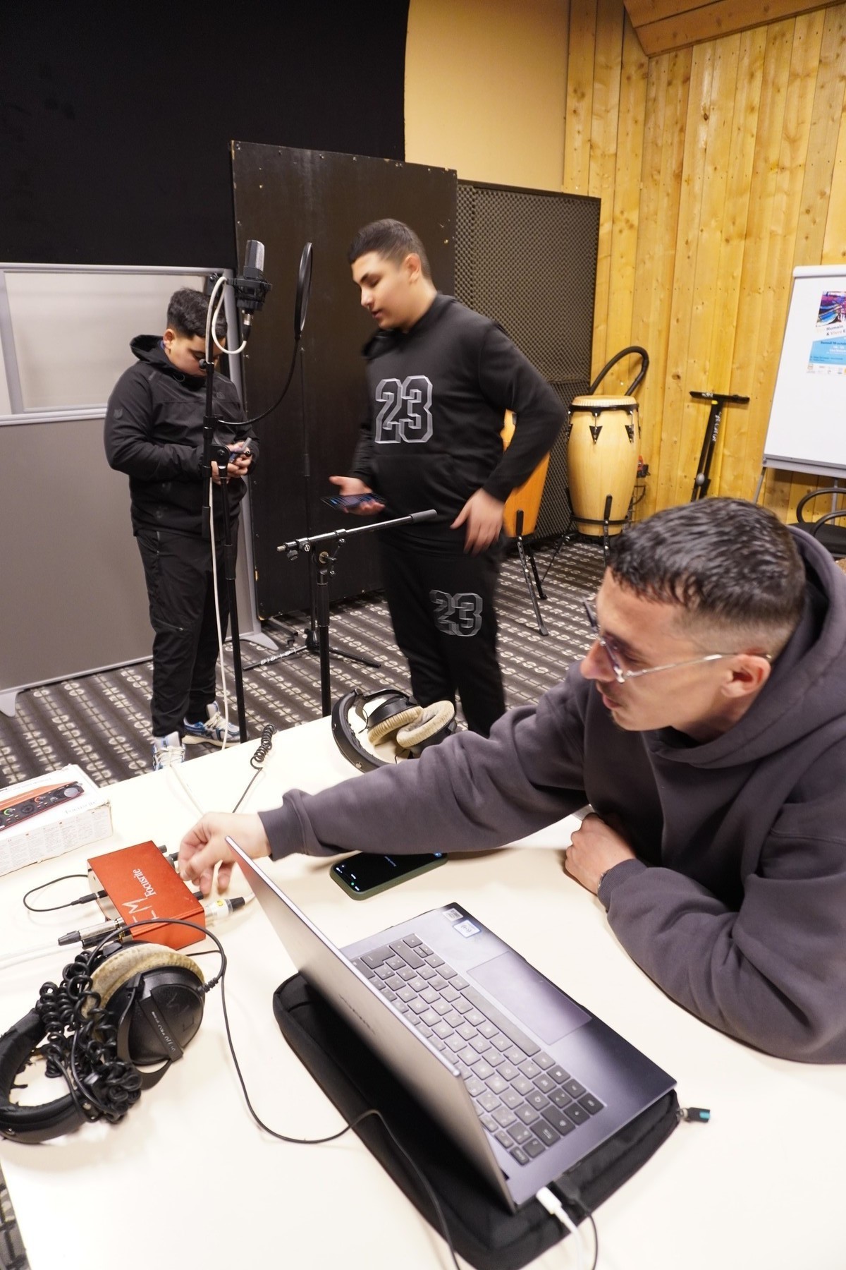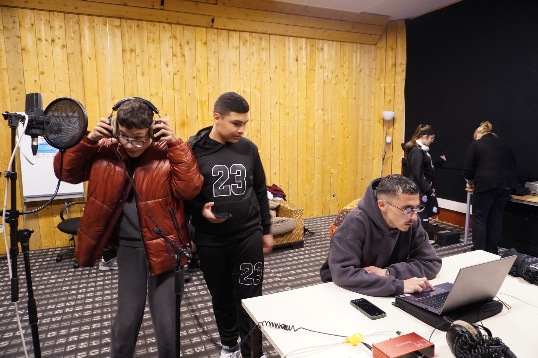 Ensuite sous la supervision et les conseils de Tino, ils ont enregistré leurs textes individuels ; des textes de leur composition avec la prod qu’ils ont choisi. Un moment de stress, de doutes mais surtout d’encouragement ! Tout le monde n’a pas eu le temps de passer alors… affaire à suivre !