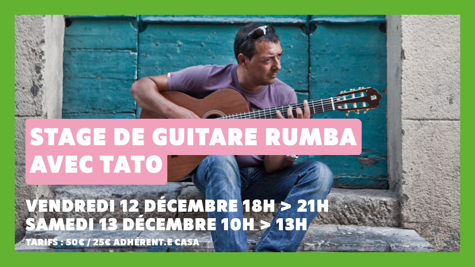 Technique du fameux ventilateur, arpèges, ou falsetas de la Rumba... prodigués par l'un des plus fervents et talentueux ambassadeurs de la rumba catalane. Auteur, compositeur, interprète, Antoine « TATO » GARCIA apprend la guitare dès l’âge de 7 ans aux côtés des fameux musiciens gitans de Perpignan. En virtuose de la guitare et du chant, Tato fera se rencontrer la rumba avec le son cubain de la Familia Valera Miranda, la poésie d’Agnès Jaoui, les cuivres de la fanfare Ciocarlia sans oublier ses participations remarquées au sein des groupes Tekameli, Kaloomé ou Les Rumberos Catalans.